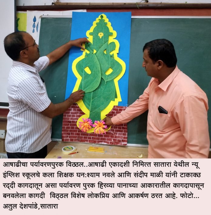 सातारा : लाखो वैष्णव भक्तांचे श्रध्दास्थान असणार्या पंढरपूर येथील श्री विठ्ठलाच्या दर्शनाची आस संपूर्ण राज्यातील भाविकांना लागली आहे. येत्या शुक्रवारी साजर्या होणार्या आषाढी एकादर्शीला हा वैष्णवांचा मेळा दर्शन घेवूनच यात्रा पूर्ण करत असतो. मात्र सातारा शहरातच आषाढी एकादशीला एका आगळ्या वेगळ्या पर्यावरण पूरक विठ्ठलाचे दर्शन घडवणार आहेत दोन कला शिक्षक. येथील डेक्कन एज्युकेशन सोसायटीच्या न्यू इंग्लिश स्कूल मधील कला शिक्षक घन:श्याम नवले आणि संदीप माळी या दोन कलाकारांनी टाकावू रद्दी कागदातून शाळेच्या प्रवेशव्दारात खास आषाढी एकादशीच्या निमित्ताने पर्यावरण पूरक विठ्ठल साकारला आहे. हिरव्या पानांच्या सुरेख कलाकृतीतून हा विठ्ठल विटेवर उभा असून सार्या देशातच पर्यावरणाचे सामाजिक भान जपत धार्मिक सोहळे साजरे व्हावेत हीच या कलाकृतीमागील संकल्पना असल्याचे यावेळी या दोघांनी सांगितले. दरवर्षी नवनवीन उपक्रमातून हे दोन कला शिक्षक खर्या अर्थाने शाळेचे, संस्थेचे आणि याच बरोबर शहराचेही नाव वेगळ्या कलाकृतीने जोपासत आहेत. या उपक्रमाबद्दल शाळेेचे विश्वस्त व शालेय समितीचे अध्यक्ष अमित कुलकर्णी मुख्याध्यापक सुरेश शिवले, उपशालाप्रमुख बी. एस. कांबळे, पर्यवेक्षक दिलीप रावडे, लता दळवी, निलम तिरमारे यांच्यासह सर्व शिक्षक शिक्षीकांनी शुभेच्छा दिल्या आहेत.