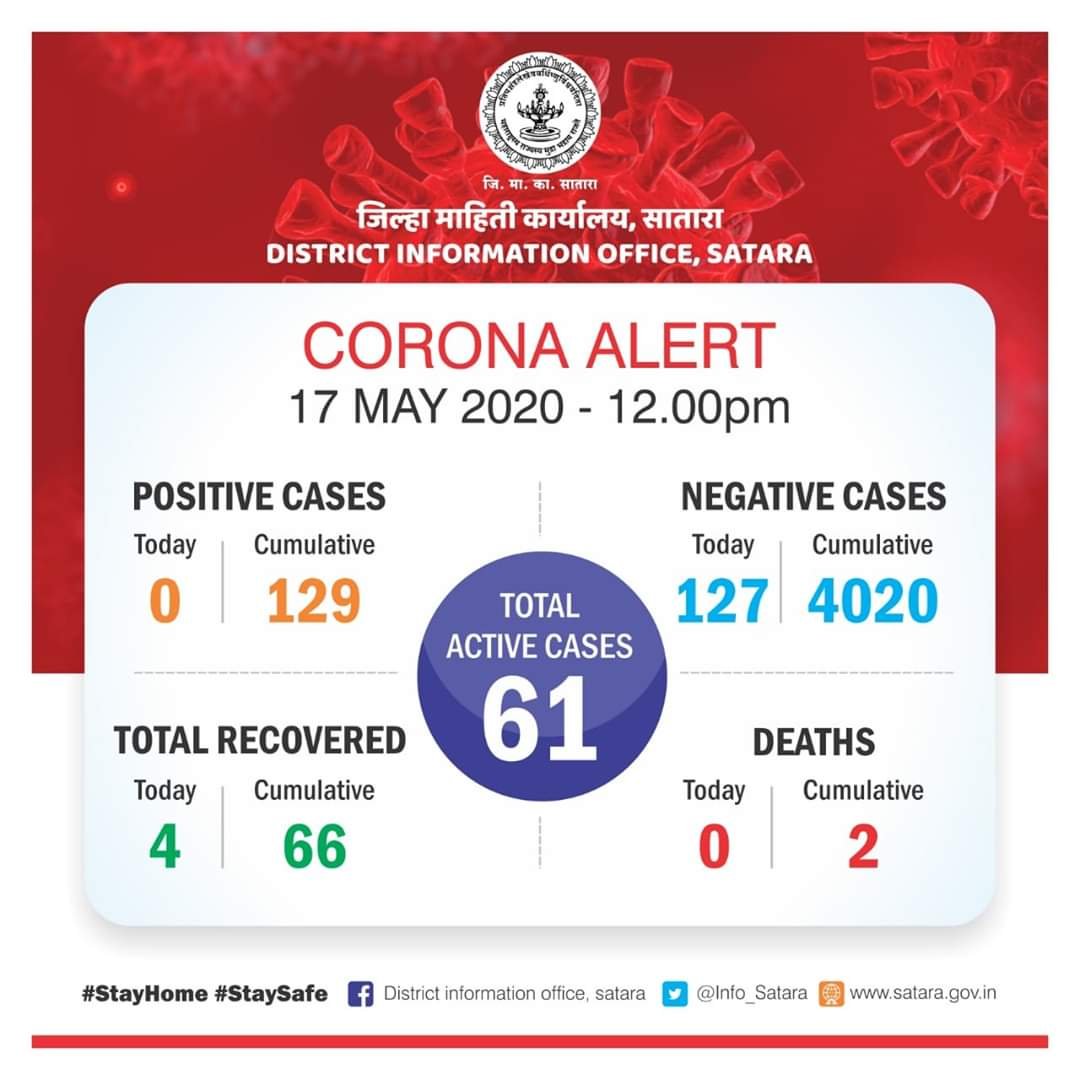सातारा : वेणूताई चव्हाण उपजिल्हा रुग्णालय कराड येथील एका आरोग्य कर्मचारी जी जी राधिका रोड येथील गार्डन सिटी येथे राहत होती ,ती जिल्हा रुग्णालय, सातारा येथे उपचार घेत होती. तसेच मुंबईवरून आलेला प्रतापगंज पेठेतील युवक ही कोरोना मुक्त होऊन त्यांना आज घरी सोडण्यात आले. सह्यादी रुग्णालय, कराड येथील 2, यांचे निगेटिव्ह रिपोर्ट आल्यामुळे या चौघांना आज रुग्णालयातुन सोडण्यात आले अशी माहिती जिल्हा शल्यचिकित्सक डॉ. आमोद गडीकर यांनी दिली आहे.