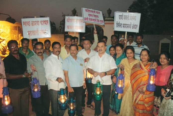 नगरविकास आघाडीच्या नगरसेवकांचे कंदील पेटवून अनोखे आंदोलन