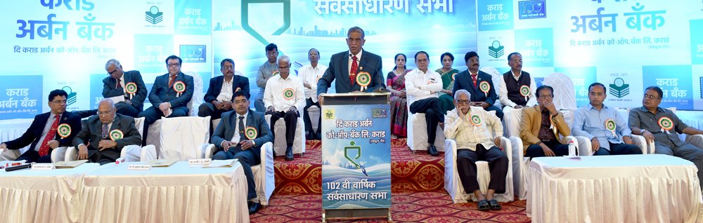 कराड अर्बन बँकेची 102 वी वार्षिक सर्वसाधारण सभा कराड येथील पंकज मल्टीपर्पज हॉल येथे बँकेचे अध्यक्ष डॉ.सुभाष एरम यांच्या अध्यक्षतेखालीनुकतीच (रविवारदि.22 रोजी) खेळीमेळीच्या वातारणामध्ये संपन्न झाली. यावेळी बँकेचे उपाध्यक्ष समीर जोशी, अर्बन कुटुंब प्रमुख सुभाषराव जोशी, मुख्य कार्यकारी अधिकारी सीए.दिलीप गुरव आणि सर्व संचालकांसह सभासदांची लक्षणीय उपस्थिती होती.