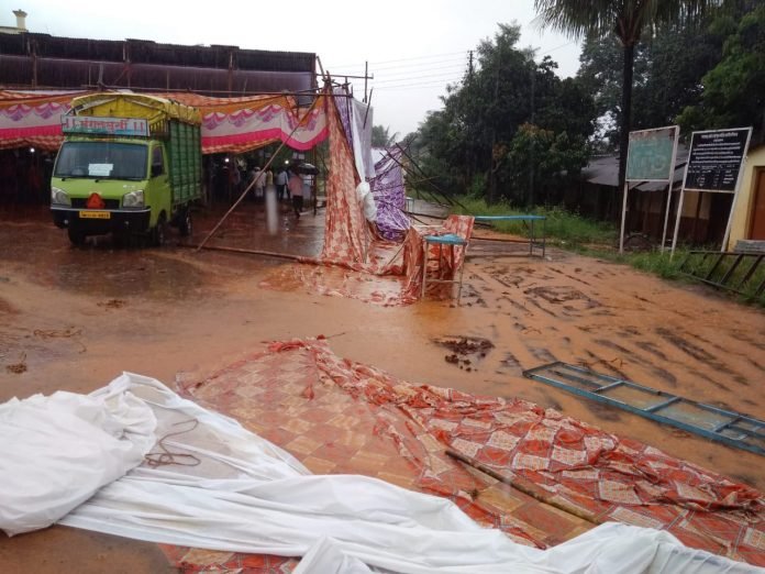 पाटण:- गेल्या दोन दिवसापासून सुरू झालेल्या पाऊसात शनिवारी सायंकाळी निवडणूक प्रचाराच्या तोफा थंडावल्या असल्या तरी निवडणुकीसाठी शासकीय यंत्रणा मात्र भर पाऊसात सज्ज झाल्याचे चित्र दिसत आहे. शनिवारी सकाळ पासून पाटण परिसरात पाऊसाचा जोर वाढला असताना अशा पाऊसात मतदानासाठी झालेल्या तयारीत शासकीय यंत्रणेची मात्र तारांबळा उडाली. येथील बाळासाहेब देसाई महाविद्यालयाच्या मैदानावर २६१ पाटण विधानसभा व ४५ सातारा लोकसभा पोटनिवडणुकीसाठी शासकीय यंत्रणेची जय्यत तयारी सुरु असताना यासाठी उभा केलेला मंडप पाऊसाने अनेक ठिकाणी पडला तर मैदानावर सगळीकडे चिखल झाला. वाहतुकीची मोठ्या प्रमाणात कोंडी झाली. अशा परस्थितीत व भर पाऊसात निवडणूक कर्मचारी, अधिकारी आपले कर्तव्य बजावताना दिसत होते.