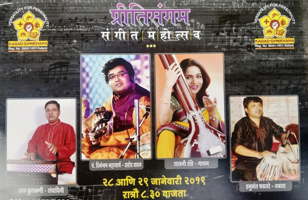 कराड : सुप्रसिध्द गायिका सावनी शेंडे व प्रख्यात सरोद वादक पं. निभंजन भट्टाचार्य या नामवंताच्या सहभागाने दि. 28 व 29 जानेवारी 2019 रोजी प्रीतिसंगम संगीत महोत्सव संपन्न होत आहे.